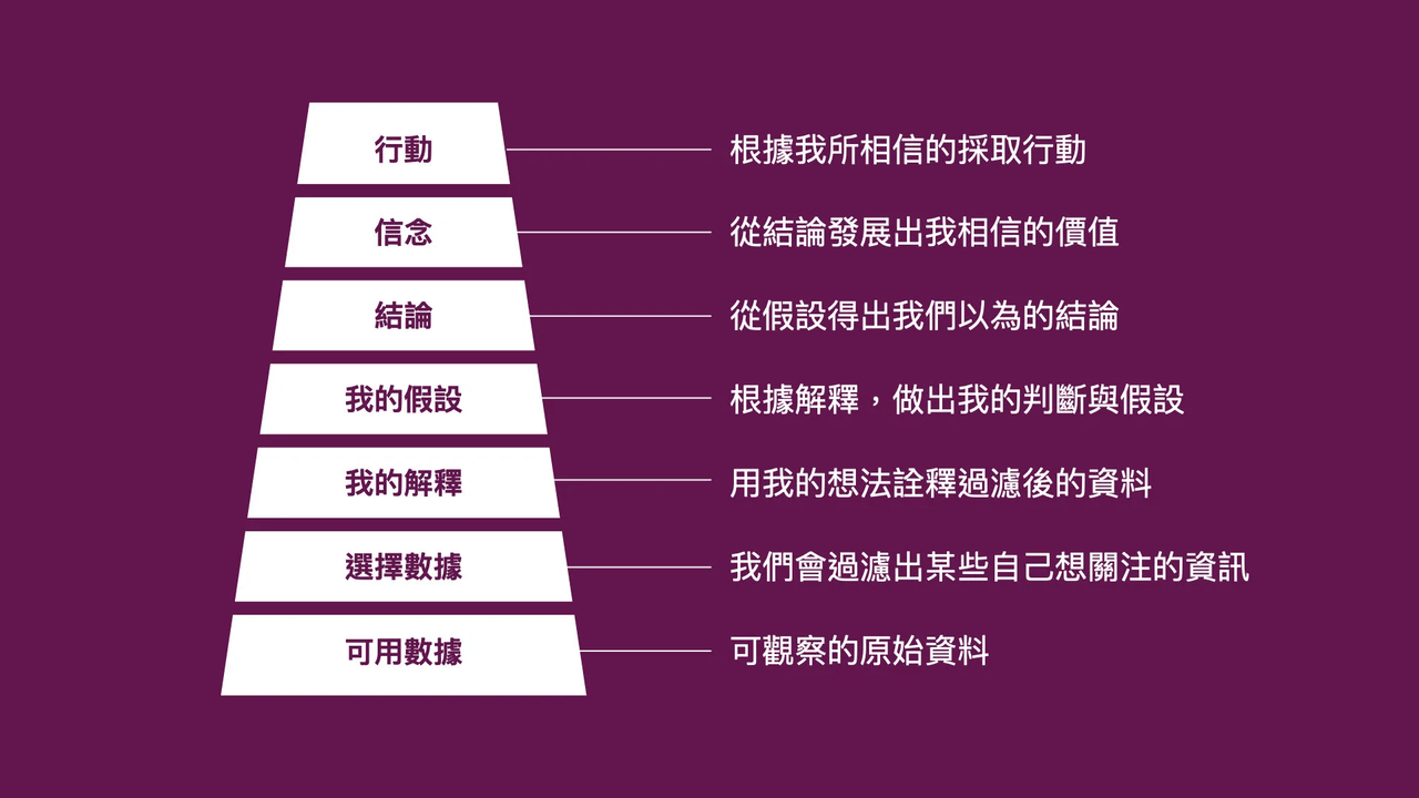 《Rethinking thinking》这个视频里介绍了「推理阶梯」这个概念,它较为详细地阐述了我们是如何处理在现实世界中感知的各种信息,分为以下七个步骤: